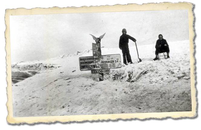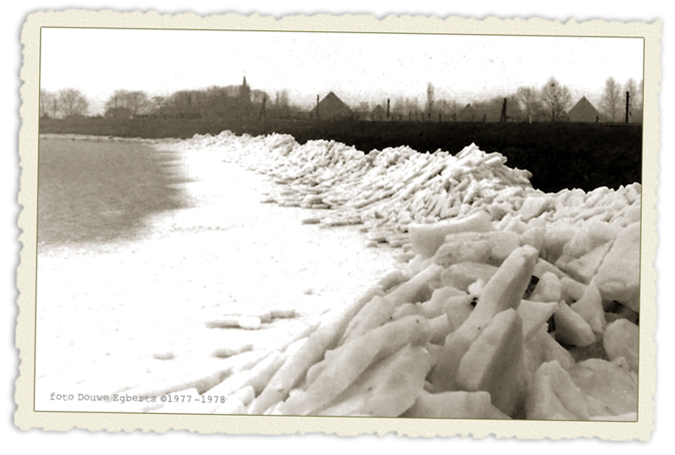 Hier twee foto’s van barre winterse omstandigheden aan de Zuiderdijk. Dikke pakken opgewaaide sneeuw boden mogelijkheden om te spelen. Kruiend ijs kon hele bomen omdrukken.