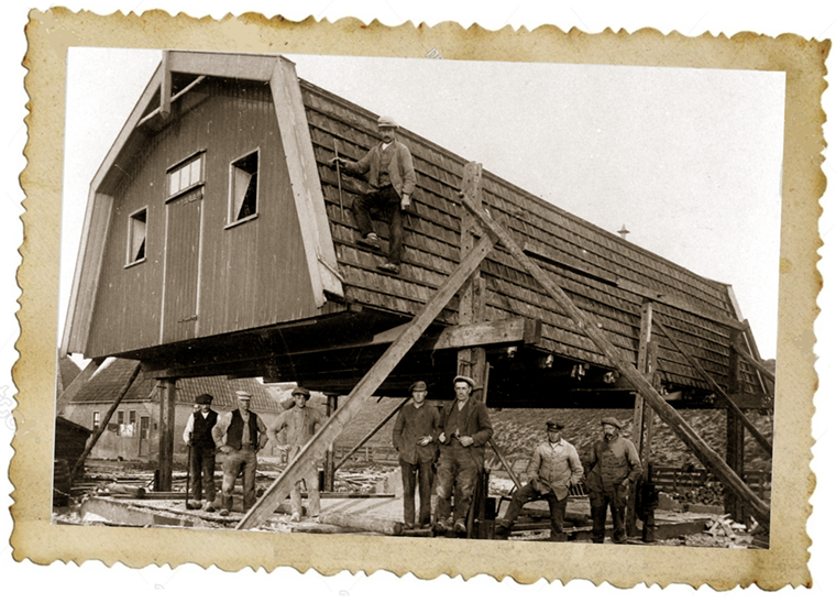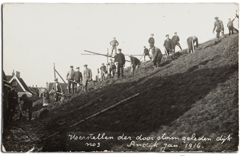Uit de collectie van het Zuiderzeemuseum zijn de volgende foto’s uit 1916, toen bij Andijk op een haar na een dijkdoorbraak werd voorkomen, bijvoorbeeld door zeilen en zandzakken te plaatsen. Schade werd met man en macht hersteld en de huizen in Andijk werden met het oog op toekomstige rampspoed verrold.
