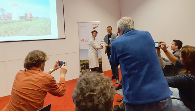 In een volgepakt zaaltje van de jaarbeurs mocht Pim Kuipers met een kleine powerpointpresentatie zijn project presenteren, waarna Ankie van Dijk, directeur van Wandelnet, het eerste exemplaar van de wandelgids overhandigde aan Nico Slagter (voorzitter Recreatieschap Westfriesland). Ik was natuurlijk vooral benieuwd hoe de route was ingestoken en waar hij afwijkt van de loop van de dijk.